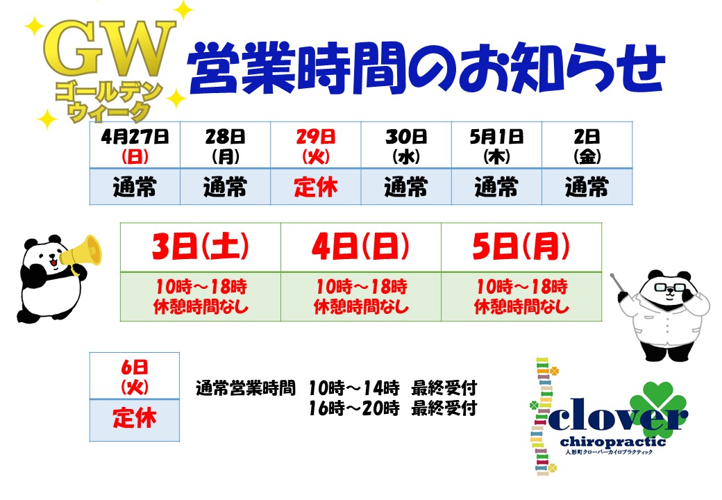 いつも人形町駅前整体院~クローバーカイロプラクティック~をご愛顧頂きありがとうございます。