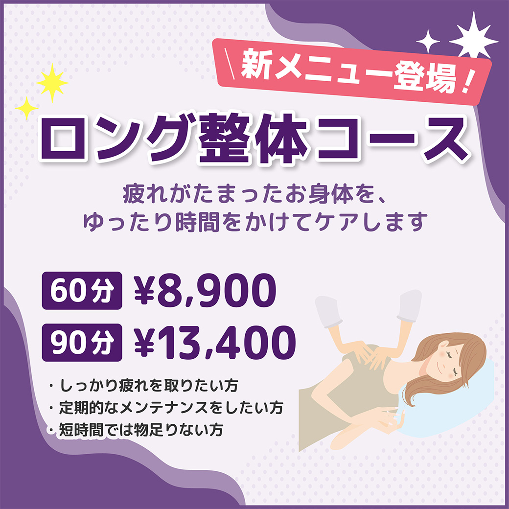 【東小金井駅前整体院】新メニュー登場!!ロング整体コースはじめました2025.08.06 この記事のタイトルとURLをコピーするこんにちは!東小金井駅前整体院です。 このたび、しっかり施術を受けたい方にぴったりの【ロング整体コース】がスタートしました!✅ 短時間では物足りない方 ✅ 疲れを根本からケアしたい方 ✅ 定期的にメンテナンスしたい方 におすすめのメニューとなっております! 【施術時間&料金】 ●60分 ¥8,900 ●90分 ¥13,400東小金井で整体院をお探しなら当院へ! 皆様のご来院をお待ちしております。 この記事のタイトルとURLをコピーする 【武蔵小金井駅前整体院・武蔵小金井駅前整骨院】時短営業のお知らせ前の記事 【小金井坂下整体院】9月限定。通ったほどお得!通院ボーナスキャンペーンを開催次の記事
