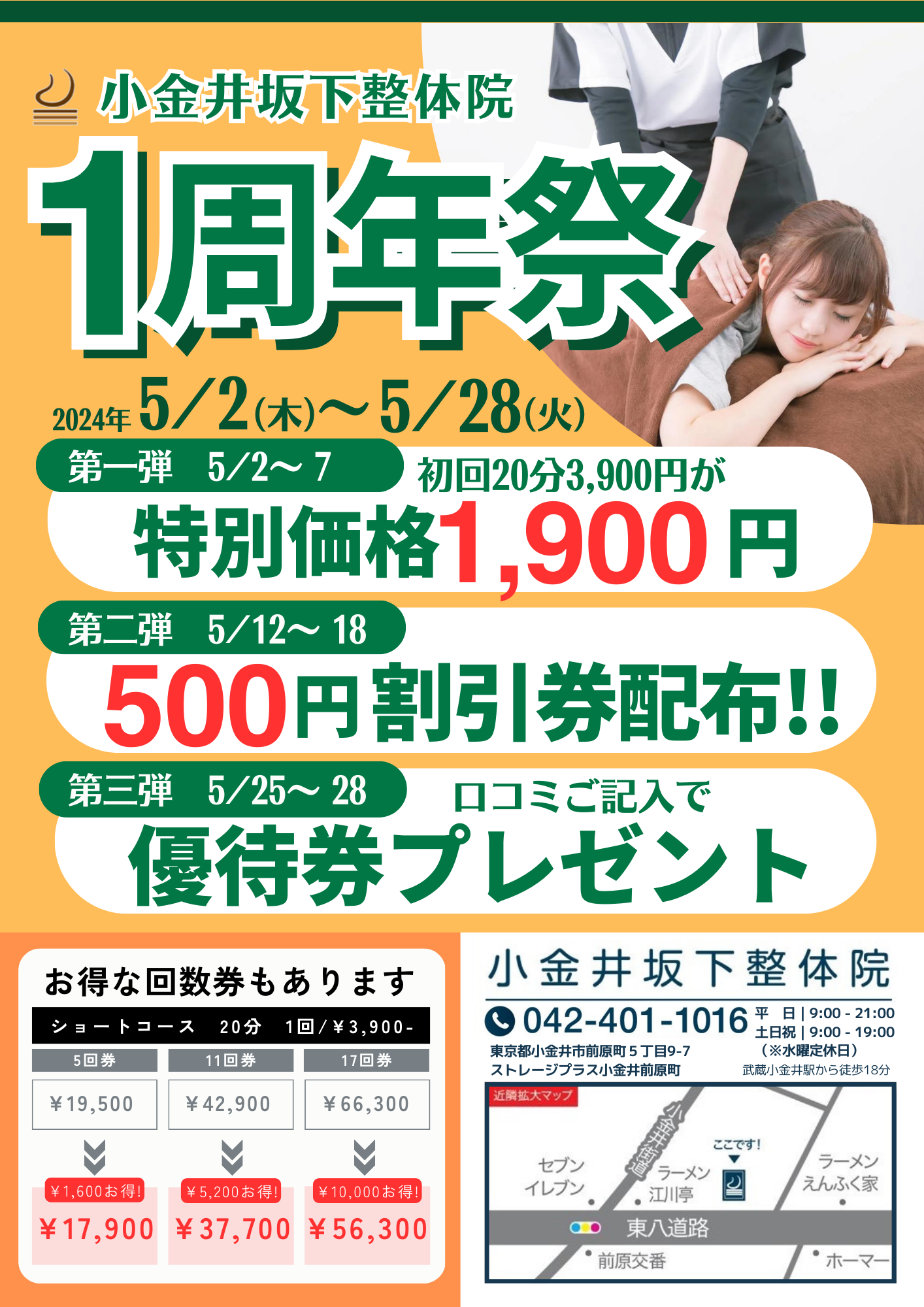【小金井坂下整体院】1周年記念キャンペーン開催のお知らせ