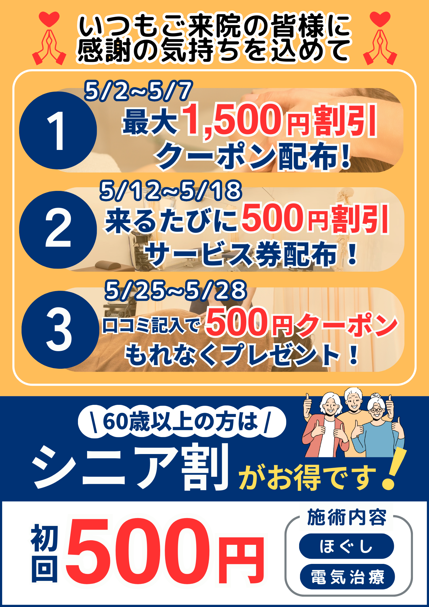 1回目のご来院で500円分、2回目のご来院で1000円分ご利用できる、計1500円分のクーポン配布を配布させていただきます!