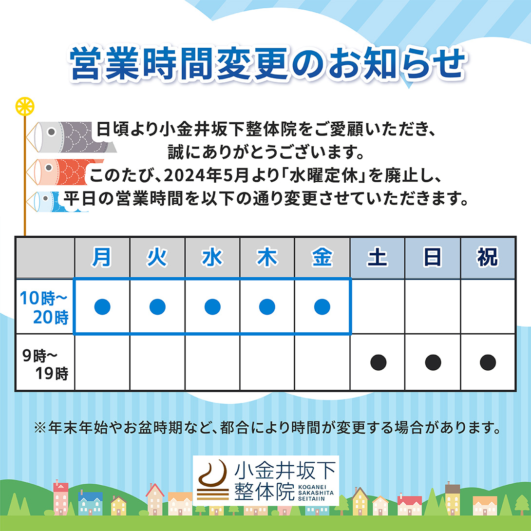 【小金井坂下整体院・小金井坂下整骨院】営業時間変更のお知らせ2025.04.16 この記事のタイトルとURLをコピーする営業時間変更のお知らせいつも小金井坂下整体院・小金井坂下整骨院をご愛顧頂きありがとうございます。このたび当院では、5月より「水曜定休」を廃止し、平日の営業時間を変更させていただくこととなりました✨🎉【平日の営業時間】 10時〜20時 定休日なし【土日祝の営業時間】 9時〜19時ご予約はお電話、もしくはLINEのオンライン予約をご利用ください✨ ご来店お待ちしております。 この記事のタイトルとURLをコピーする 【人形町駅前整体院~クローバーカイロプラクティック~】19周年記念イベント開催!前の記事 【人形町駅前整体院~クローバーカイロプラクティック~】料金改定のお知らせ次の記事
