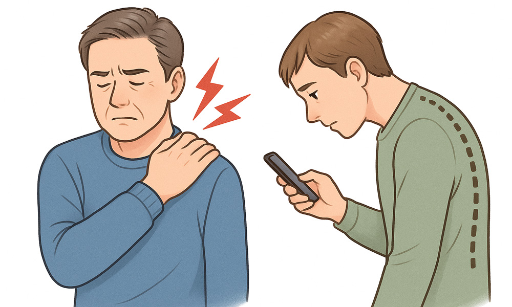デスクワークやスマホ、猫背の姿勢で骨が前に引っ張られ、胸の筋肉(大胸筋)や肩の後ろの筋肉(棘下筋など)が硬くなり、骨を前に押し出してしまうことで、肩の骨と骨がぶつかり、腱や関節包が炎症を起こし、強い痛みにつながります。